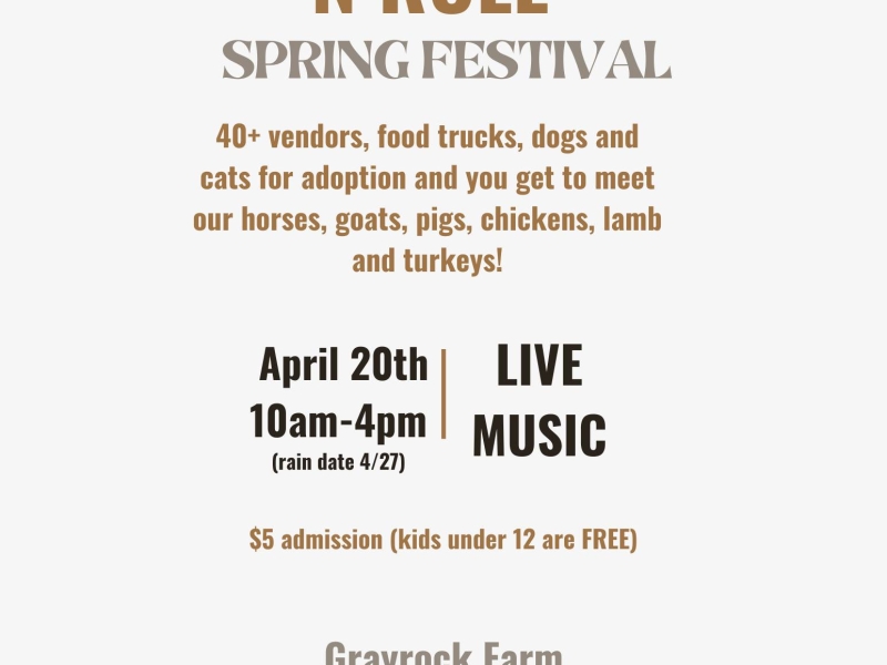 Join us for our Spring festival where we'll have LIVE music, more food vendors than we've ever had before, over 40 vendors selling art, candles, health and beauty, home decor, jewelry, pet supplies, toys, wreaths and much more PLUS dogs and cats for adoption. Best of all you get to meet our horses, goats, pigs, chickens, ducks, lamb and turkeys! Come spend an afternoon on the farm listening to music, eating and meeting some new four legged friends!